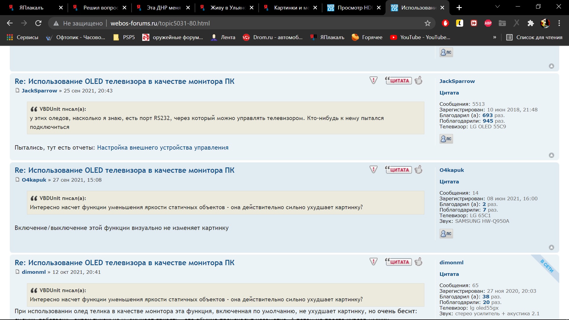 При использовании олед телика в качестве монитора эта функция, включенная по умолчанию, не ухудшает картинку, но очень бесит: сидишь работаешь, экран тихонько уменьшает яркость - это обычно происходит незаметно. А потом не просто курсор мышки перемещаешь, а открываешь контекстное меню, двигаешь окно или переключаешься на другое окно: и экран довольно резко (не прям следующий кадр, но очень быстро) поднимает яркость.VBDUnit писал(а):Интересно насчет функции уменьшения яркости статичных объектов - она действительно сильно ухудшает картинку?
