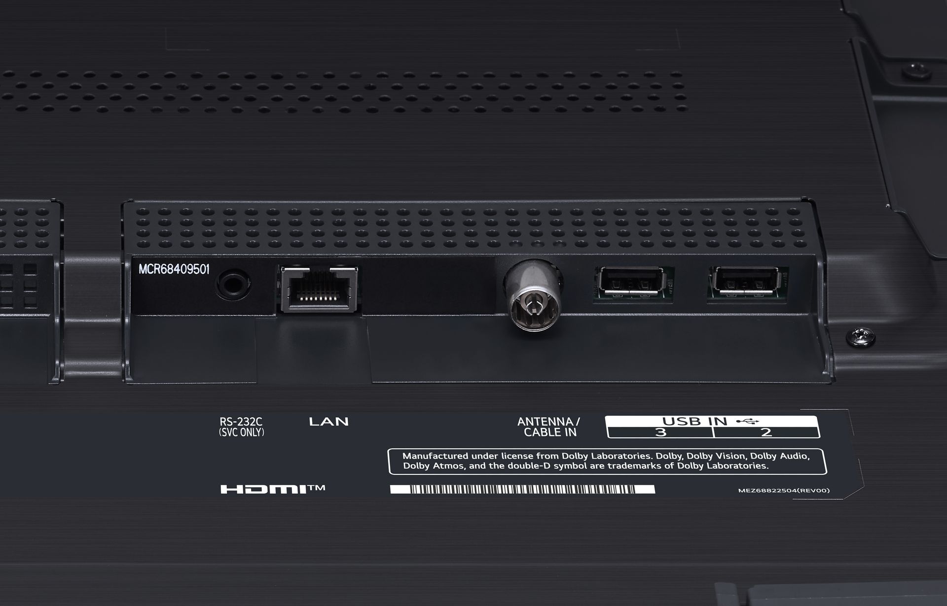 Задняя панель телевизора LG NANO92 оснащена следующими интерфейсами: 2 антенных входа (для спутникового и кабельного/эфирного ТВ), компонентный AV-вход (в версии для США), один порт LAN (со скоростью 100 Мбит/сек), два порта USB (версии 2.0). Что касается аудио, то на этой же панели расположен только выход 3,5" для наушников.