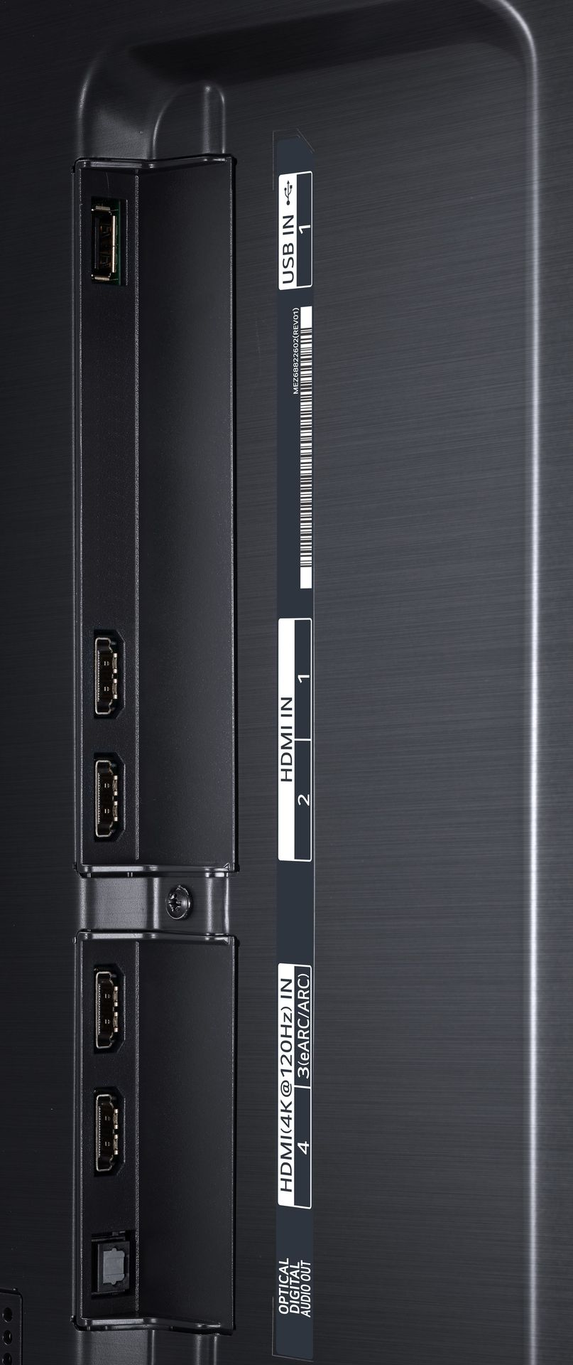 Боковая панель оснащена двумя входами HDMI v.2.1 (один из которых совместим с ARC и eARC), двумя входами HDMI v.2.0, одним портом USB (версии 2.0), оптическим аудиовыходом и слотом условного доступа CI+. Кроме того на борту имеются встроенные беспроводные модули Wi-Fi (с поддержкой стандартов 802.11a, 802.11b, 802.11g, 802.11n, 802.11n 5 ГГц, 802.11ac, Wi-Fi Direct) и Bluetooth (поддерживается сопряжение с совместимыми устройствами по протоколам Bluetooth 5.0 и apt-X).