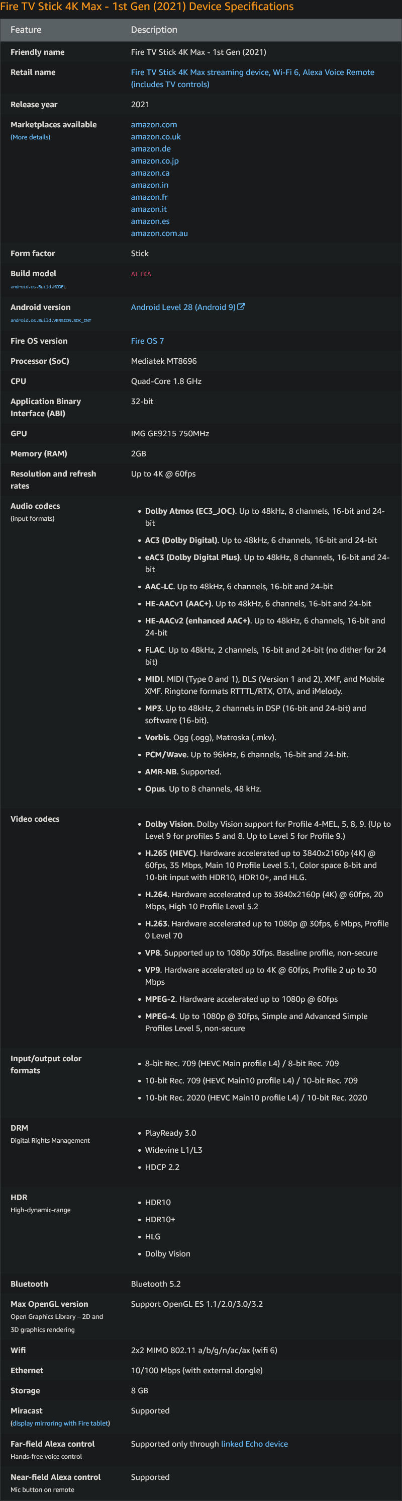 Fire TV Stick 4K Max оснащен более быстрым процессором MediaTek MT8696. В то время как предыдущая модель имела четырехъядерный ЦП 1,7 ГГц и графический процессор 650 МГц, новая модель имеет четырехъядерный ЦП 1,8 ГГц и 750 МГц. Он также имеет 2 ГБ оперативной памяти вместо 1,5 ГБ в предыдущей модели. Хотя изменения могут показаться небольшими, они должны сделать интерфейс и воспроизведение более быстрым.