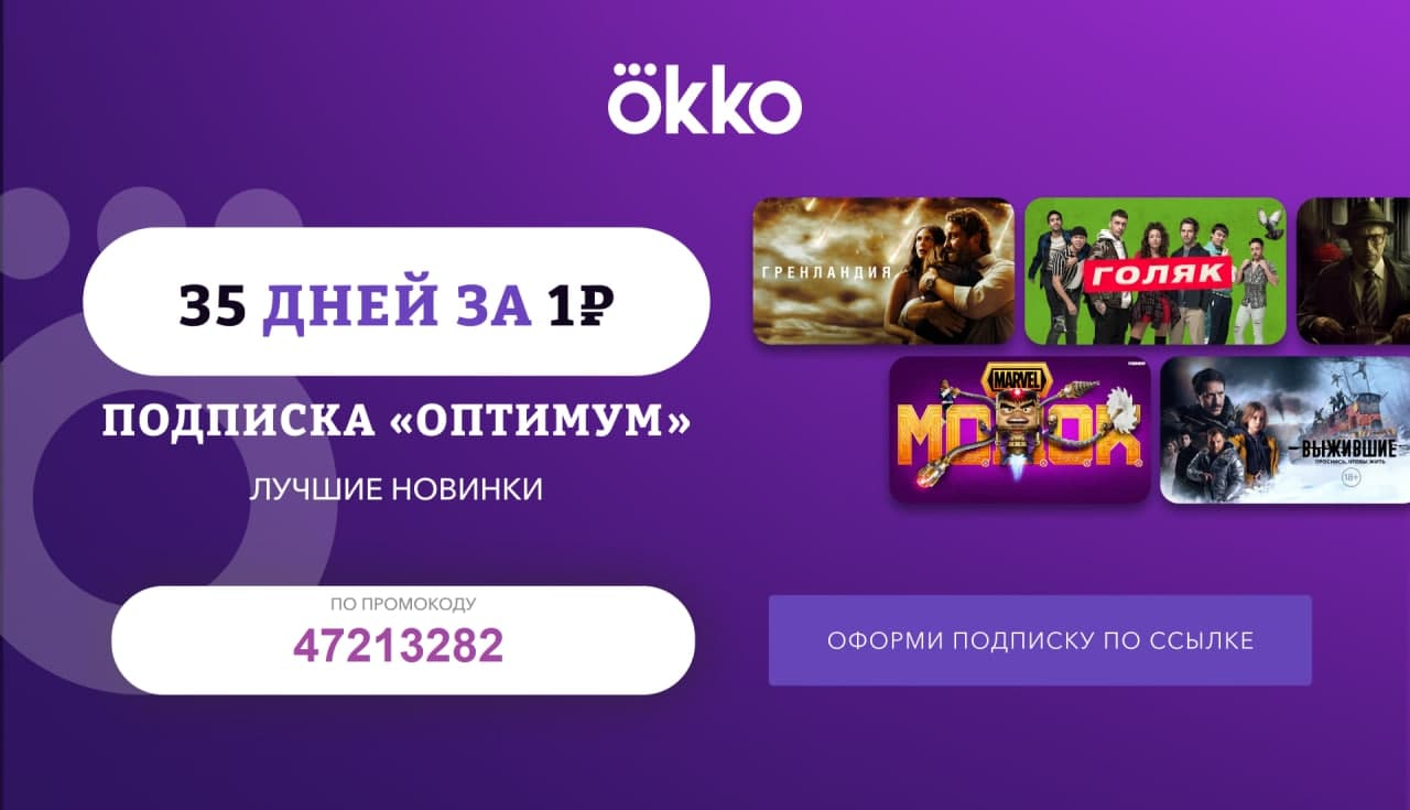 Okko: 35 дней подписки «Оптимум»Okko — это сервис, в котором можно смотреть фильмы, сериалы и мультфильмы в превосходном качестве с потрясающим звуком и без рекламы. Наслаждаться просмотром новинок и любимых фильмов в Okko можно на Smart TV, игровых консолях PlayStation 4, XBOX, на мобильных устройствах (Android и iOS) и на сайте.