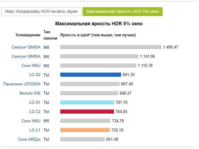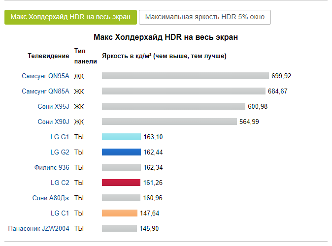 Графики ниже показывают яркость C2 и G2 при отображении полностью белого экрана и при отображении белой области, занимающей пять процентов черного фона. Плохая новость заключается в том, что полноэкранный белый дисплей не был (значительно) улучшен с новыми OLED-телевизорами. График показывает четкое разделение между высококачественными ЖК-телевизорами и моделями OLED.