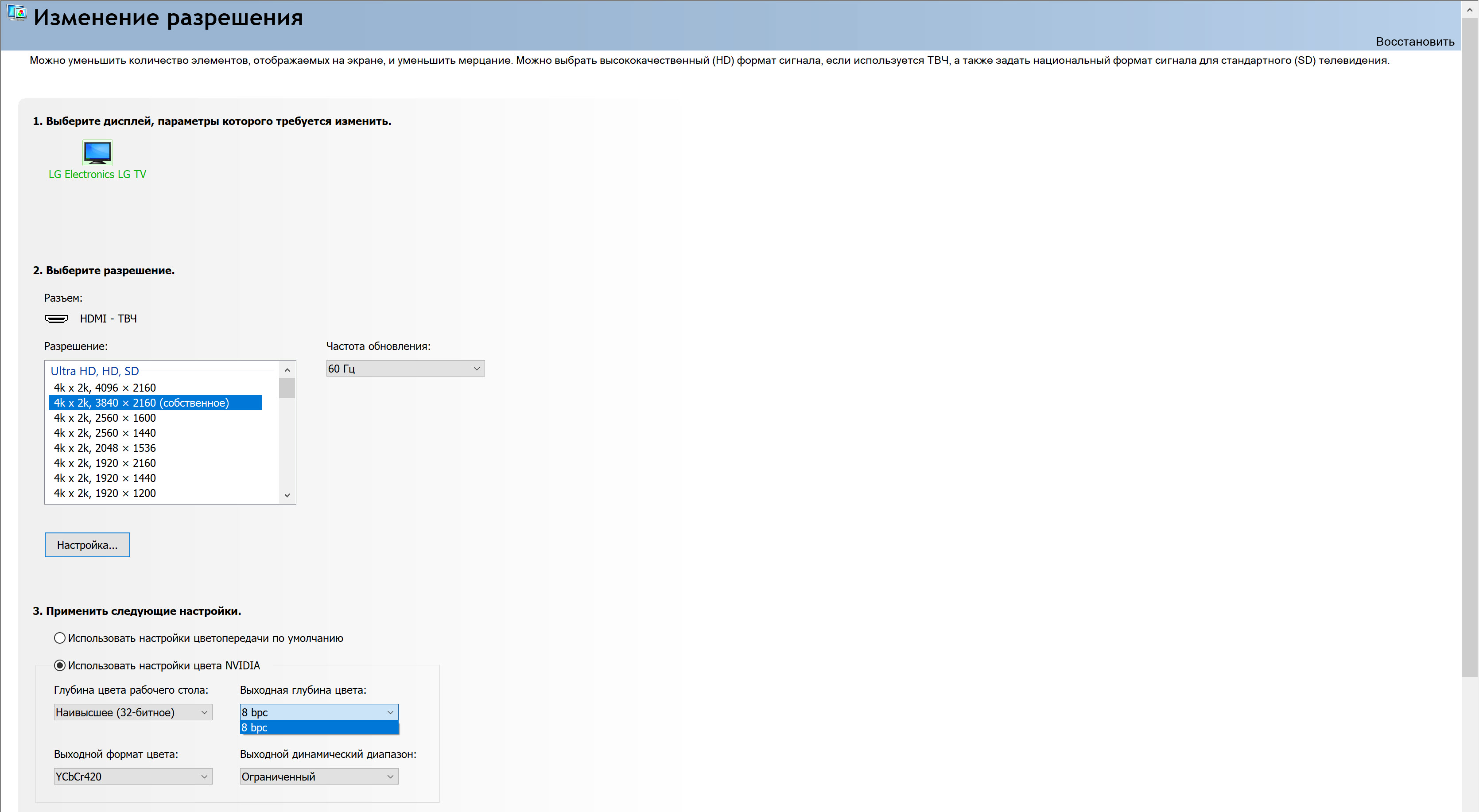 Поддержка вроде заявлена, а пункта такого в драйвере nvidia нет. У соседнего монитора включается, а у ТВ не хотит.