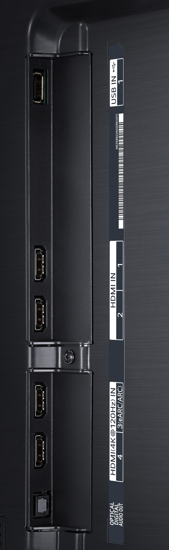 Боковая панель оснащена двумя входами HDMI v.2.1 (один из которых совместим с ARC и eARC), двумя входами HDMI v.2.0, одним портом USB (версии 2.0), оптическим аудиовыходом и слотом условного доступа CI+. Кроме того на борту имеются встроенные беспроводные модули Wi-Fi (с поддержкой стандартов 802.11a, 802.11b, 802.11g, 802.11n, 802.11n 5 ГГц, 802.11ac, Wi-Fi Direct) и Bluetooth (поддерживается сопряжение с совместимыми устройствами по протоколам Bluetooth 5.0 и apt-X).