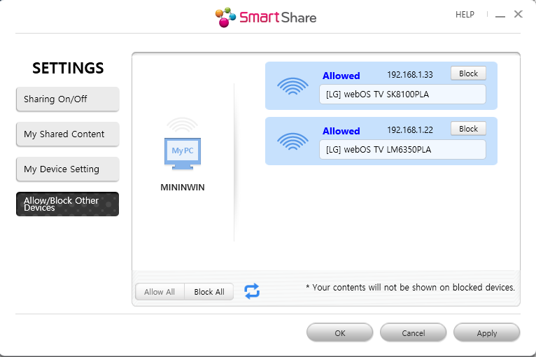 Из программы Smart Share, установленной на компьютере, я вижу этот телевизор как устройство, оно в разрешенных (см. скриншот ниже), я даже могу с компьютера запустить на этом телевизоре фильм (правой кнопкой мыши Play to), но с самого телевизора у меня этот номер не проходит.