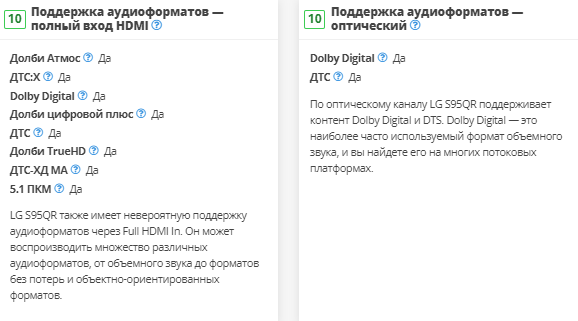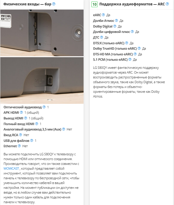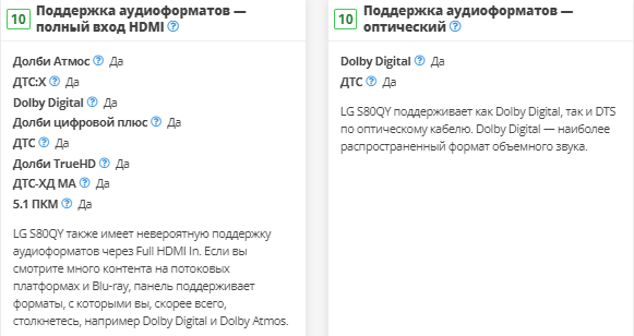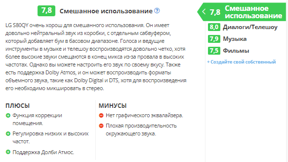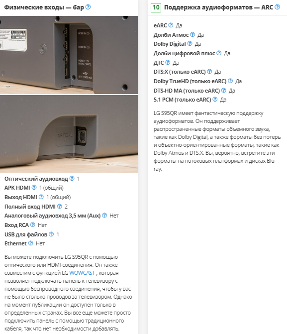 LG S80QY имеет плохую производительность объемного звучания, что типично для систем 3.1. У него нет дискретных каналов окружающего звучания, поэтому для их воспроизведения ему приходится микшировать объемные файлы, такие как Dolby Digital и DTS, в стерео. В результате звук не кажется таким захватывающим? — звук исходит не отовсюду, а вместо этого кажется, что он просто воспроизводится из динамиков, расположенных перед вами. К счастью, вы всегда можете добавить отдельный комплект задних динамиков, продаваемый производителем, если вы хотите улучшить его характеристики в будущем. Есть также LG S95QR с задними динамиками.