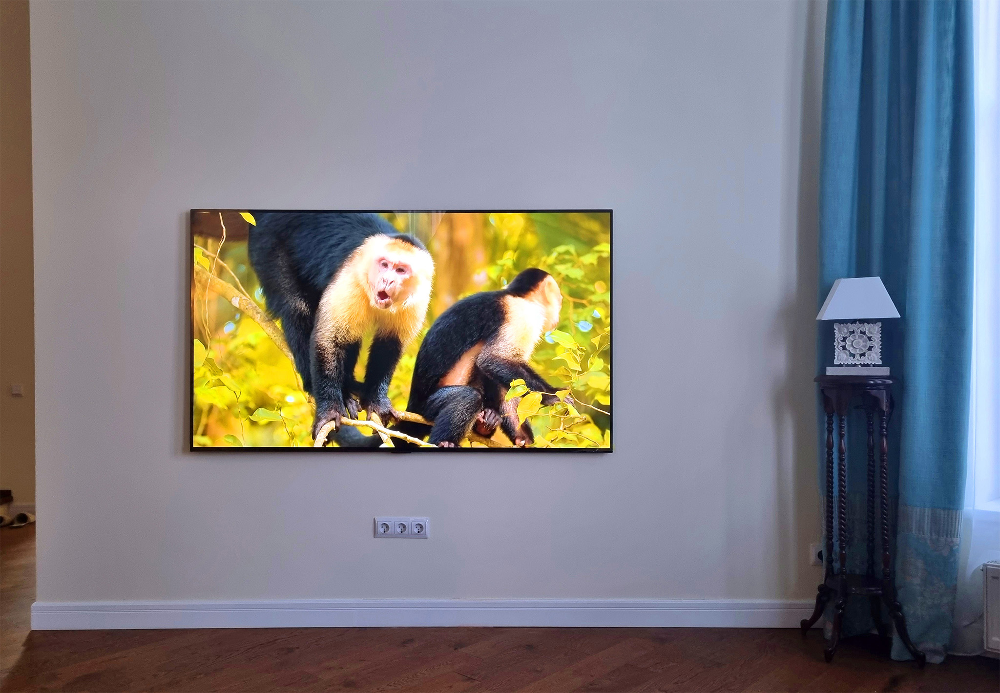 + Вау эффект обеспечен. По сути, конкуренции нет — никто не делает ТВ такой толщины, чтобы вплотную к стене лепился. Тем более, когда размер 77 дюймов, визуально он еще тоньше.