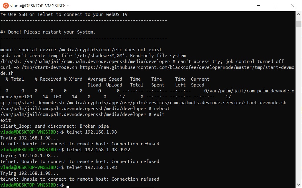 Попробовал сделать root через GetMein. Эксплойт отработал, далее при попытке зайти на ТВ через telnet, выдает сообщение "telnet: Unable to connect to remote host: Connection refused"
