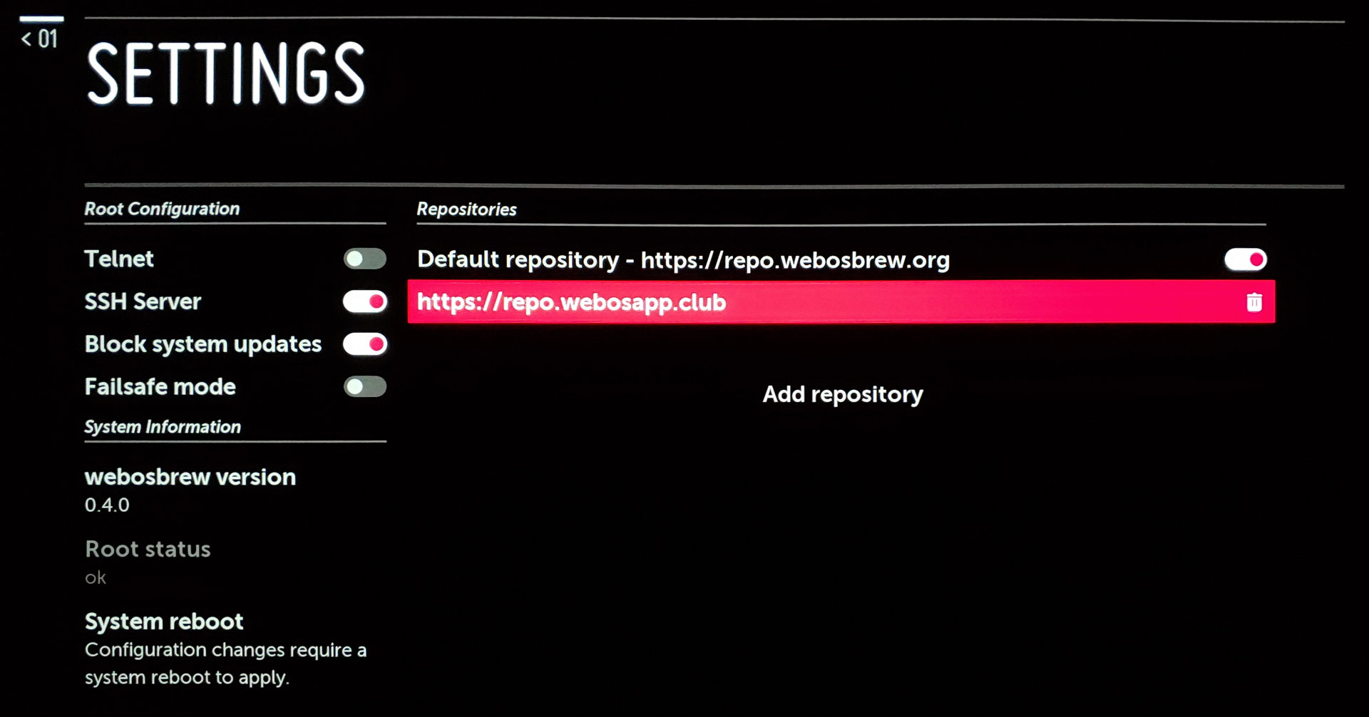 На этом список приложений в альтернативном магазине приложений для ТВ с webOS пока исчерпывается. Однако Homebrew Channel поддерживает подключение сторонних репозиториев (магазинов приложений), в которых есть гораздо больше интересных приложений, особенно для русскоязычных пользователей .
