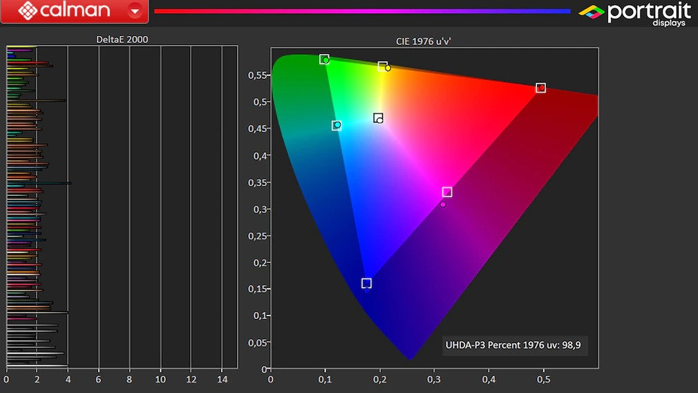 В тесте с программным обеспечением для анализа и калибровки Calman от Portrait Displays телевизор LG OLED G2 блистал очень точной цветопередачей, узнаваемой по единственным коротким горизонтальным линиям слева и почти полностью заполненному цветовому пространству справа