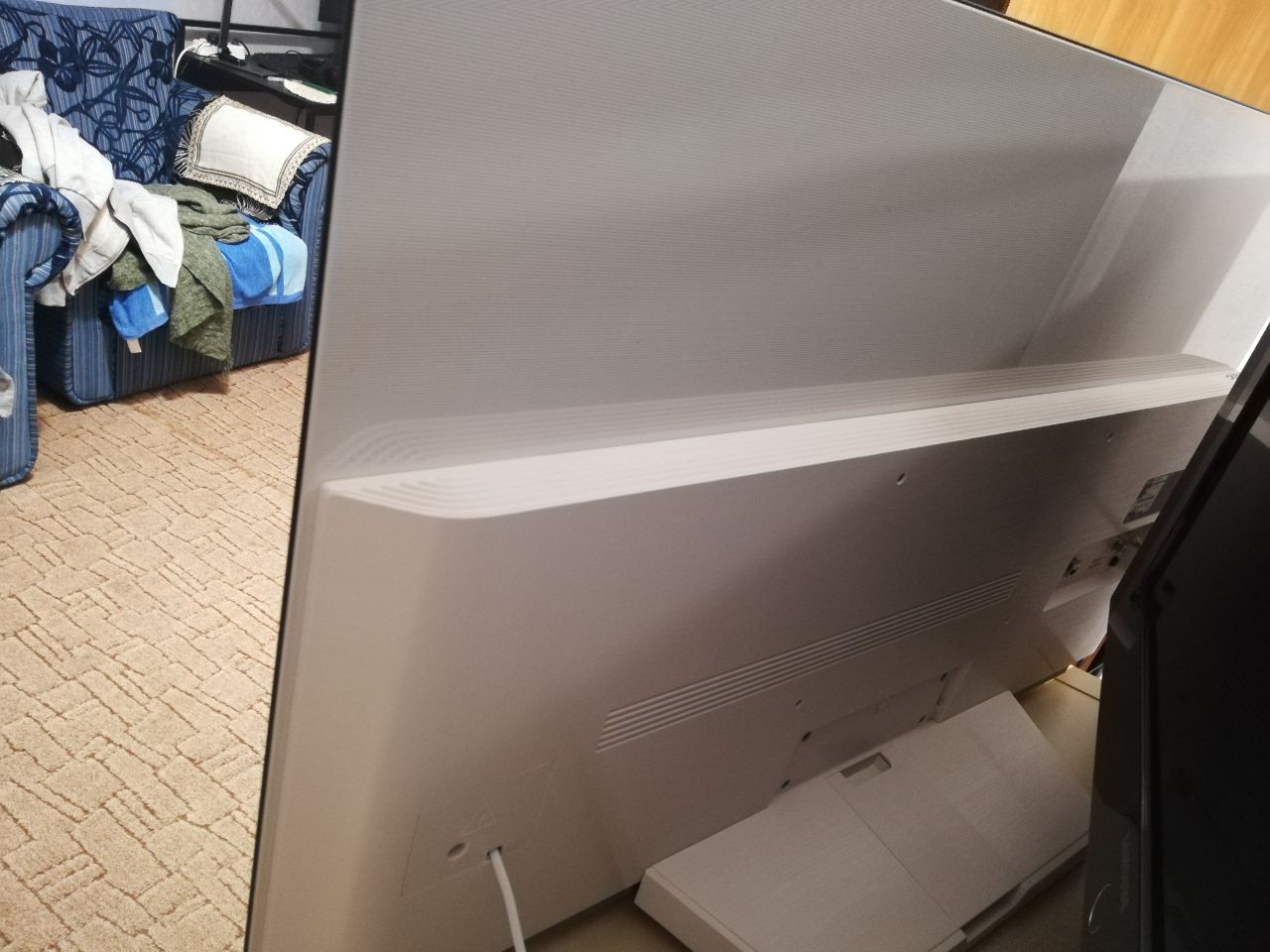 По просьбе покупатель выложил полное фото наклейки с тыльной части тв. Стало видно, что наклейка меньше посадочного гнезда, что является традиционным признаком подделки:
