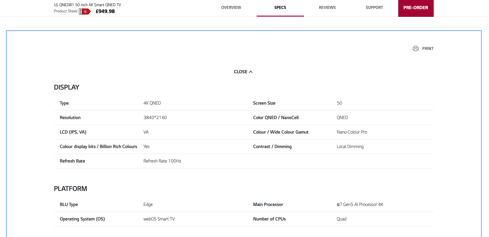 Модель QNED81 имеет аппаратную часть, построенную на модернизированном процессоре обработки изображения LG a7 Gen5 (Alpha 7, "альфа семь") пятого поколения. Данный процессор пришел на смену предыдущему решению Alpha 7 и отличается улучшенными алгоритмами обработки цветов и движений.