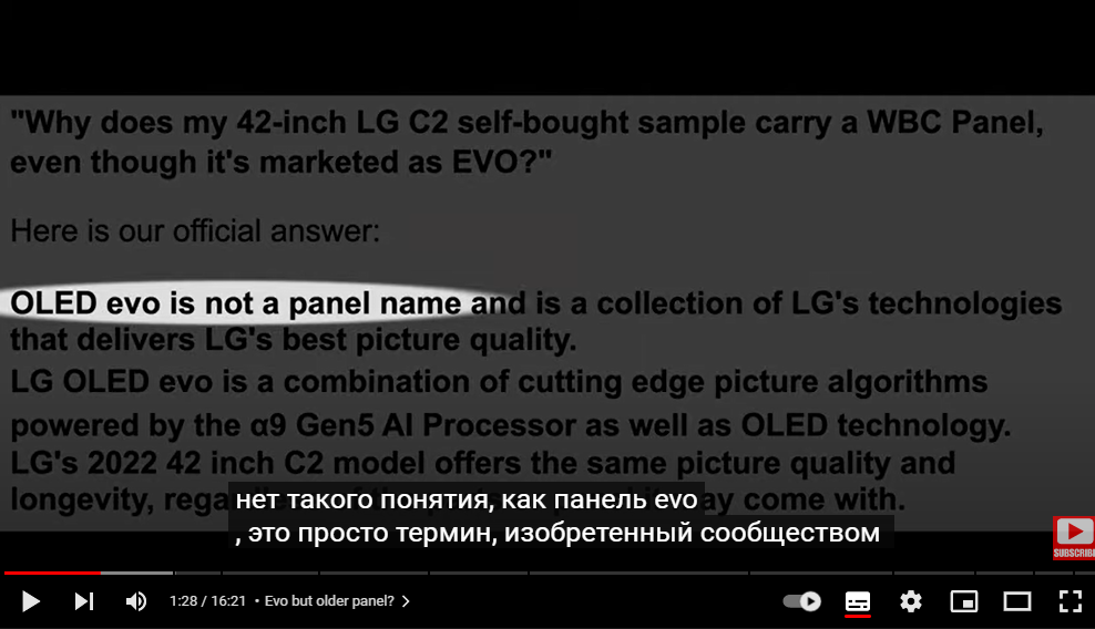Несмотря на большую путаницу на рынке в связи с ситуацией, этот термин «OLED Evo» на самом деле официально означает (как LG ответила HDTVtest, когда его спросили об этом) «комбинацию передовых алгоритмов изображения на базе процессора AI ?9 Gen 5, а также как технология OLED». Дело не в панели как таковой, а в обработке и получаемом качестве картинки. Далее они сказали, что «42-дюймовая модель LG C2 2022 года предлагает такое же качество изображения и долговечность, независимо от компонентов или панелей, с которыми она может поставляться».