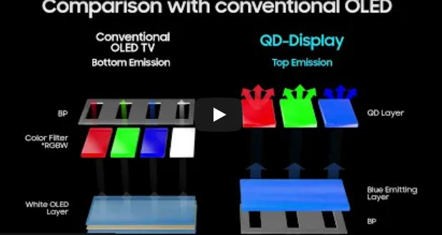 Из-за истинной субпиксельной структуры RGB, QD-OLED способен поддерживать насыщенность цвета при высокой яркости, не страдая от эффекта разбавления белого субпикселя, который имеет тенденцию влиять на WRGB OLED телевизоры (0:46 сравнение S95В с LG C1 и мастер монитором).