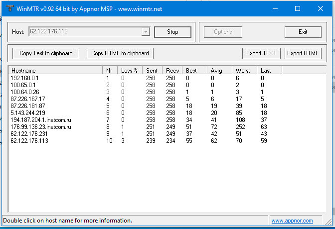 Здравствуйте. Опять Лига Чемпионов и опять Ливерпуль и опять трансляция легла в момент матча, что то тенденция хреновая)) Прилагаю трейс, обычно пинг 19-23wwwtv писал(а):Киньте трассировку в момент проблемы. Ну и mtr можно запустить до нас.