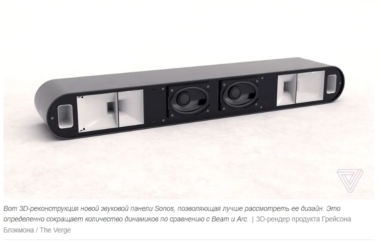 Вот 3D-реконструкция новой звуковой панели Sonos, позволяющая лучше рассмотреть ее дизайн. Это определенно сокращает количество динамиков по сравнению с Beam и Arc.3D-рендер продукта Грейсона Блэкмона / The Verge