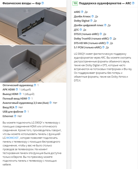 LG S90QY — это версия LG SP9YA 2022 года со встроенной технологией Meridian, помогающей воспроизводить звук. Наряду с LG S80QY, это первая звуковая панель от производителя с тремя направленными вверх драйверами для высокого содержания. Он не поставляется с задними динамиками, как S95QR, но вы можете добавить их отдельно, если хотите. Существует также поддержка TV Sound Mode Share для улучшения звука с совместимыми телевизорами LG, и вы можете купить внешний ключ WOWCAST, чтобы подключить его к телевизору по беспроводному соединению. LG S90QY имеет плохую производительность объемного звучания. Он не поставляется с отдельными сателлитами, поэтому он использует боковые драйверы, встроенные в саму панель, для имитации фантомного объемного звучания. Однако звуковые объекты, такие как гоночные автомобили или выстрелы, не появляются из точного местоположения, которое соответствует действию на экране — вместо этого кажется, что они исходят из динамика, расположенного перед вами. Если вы хотите улучшить качество окружающего звучания, вы всегда можете добавить комплект задних динамиков.