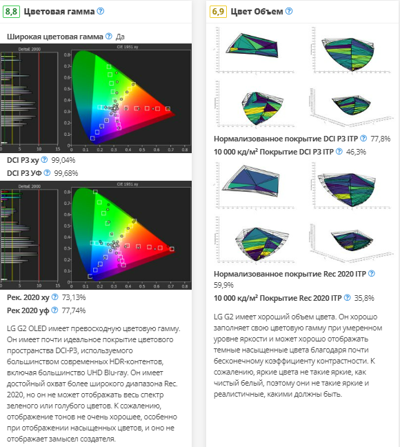 Для HDR-контента по-прежнему лучшим является режим Filmmaker со средним значением Delta E, равным 0,85, и, с нашей точки зрения, не требующим особых настроек; телевизор идеально откалиброван прямо из коробки. В режиме Cinema это также превосходно со средним значением Delta E 0,96. Пиковая яркость в режиме Filmmaker была увеличена до 946 кд/м? для шаблона 10%, то есть на сегодняшний день это самый высокий уровень яркости, который мы измеряли на OLED-телевизоре. Напомним, что предыдущая модель LG G1 была измерена на уровне 785 кд/м?. Поэтому прогресс очень значительный. Последнее справедливо и для шаблона, покрывающего весь экран. Наконец, обратите внимание, что телевизор охватывает цветовое пространство DCI-P3 на 99%, а BT2020 — на 73%, что очень удовлетворительно.