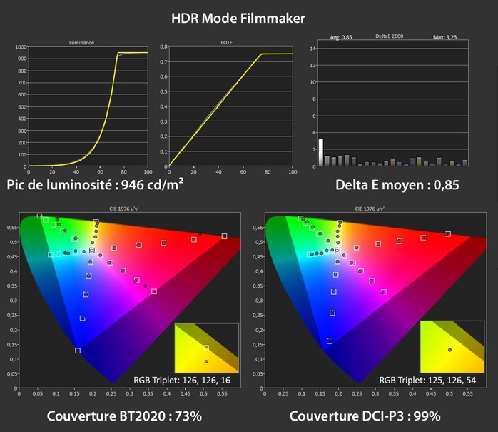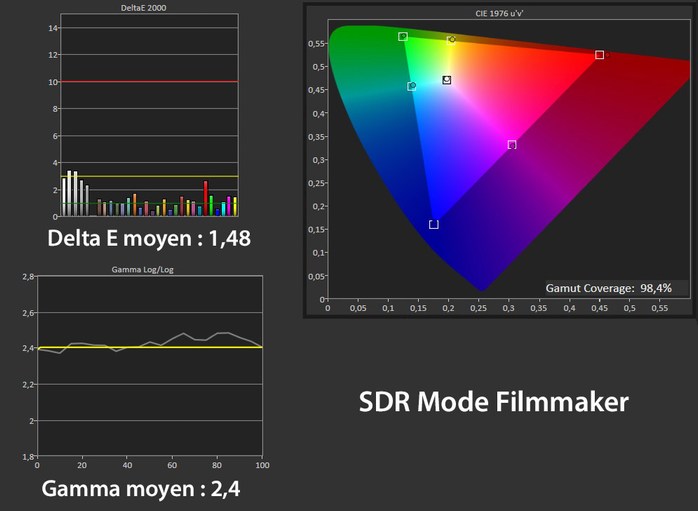 В SDR по-прежнему режим Filmmaker дает наилучшие результаты, поскольку мы смогли измерить среднее значение Delta E, равное 1,48, что значительно ниже порогового значения 3, что соответствует уровню, ниже которого человеческий глаз не может достичь большего, чтобы сделать разница между отображаемым цветом и запрошенным. В режиме Cinema это среднее значение Delta E составляет 2,19 по нашим измерениям, что все еще очень хорошо. В режиме Filmmaker мы получили среднюю цветовую температуру 6466 K, что очень близко к целевому значению, равному 6500 K. Кривая особенно стабильна по всей шкале серого. Эталонные уровни гаммы также очень хороши, так как у нас есть среднее значение 2,4, что является ожидаемым уровнем, который является идеальным. Цветовое пространство rec.709 полностью покрыто.