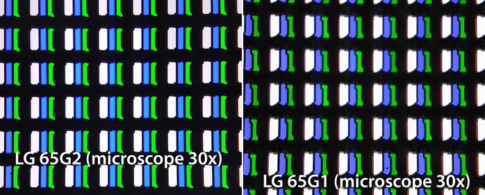 Пульт ДУ: такой же, как и в прошлом году, но без подсветки.JackSparrow @ Пульт Magic Remote для телевизоров LG 2022 годаВ телевизоре LG OLED65G2 используется панель OLED Evo производства LG Display. Это 10-битный экран с частотой 100/120 Гц, который отображает разрешение Ultra HD (3840x2160 пикселей). У него есть охлаждающая пластина, которая позволяет увеличить яркость намного больше, чем у обычных пластин. В частности, мы можем видеть различия в субпикселях на сравниваемых изображениях, сделанных под микроскопом между прошлогодней моделью G1 и новой G2.