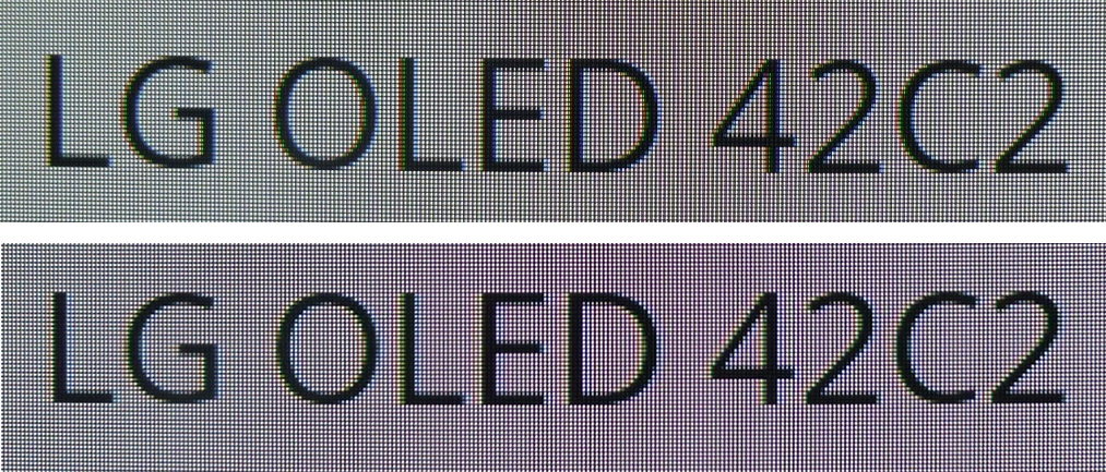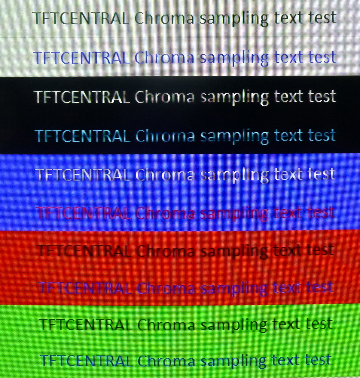 Выше приведена увеличенная фотография текста заголовка этого обзора (щелкните, чтобы открыть полноразмерное изображение). Вверху показан экран, работающий в режиме ввода с ПК, и вы можете видеть, что некоторые края имеют некоторую окантовку и не такие четкие и чистые, как могли бы быть. Интересно, что если вы переключите вход в обычный режим HDMI (т. е. не на вход ПК), то этот пример рендеринга текста станет немного лучше. Это показано на нижнем изображении. Однако этот режим не так подходит для использования на ПК, поскольку фактически он ограничен цветностью 4:2:2. Кажется, это причина, по которой этот черный текст на белом выглядит немного четче, возможно, он размывает и смягчает некоторые края.
