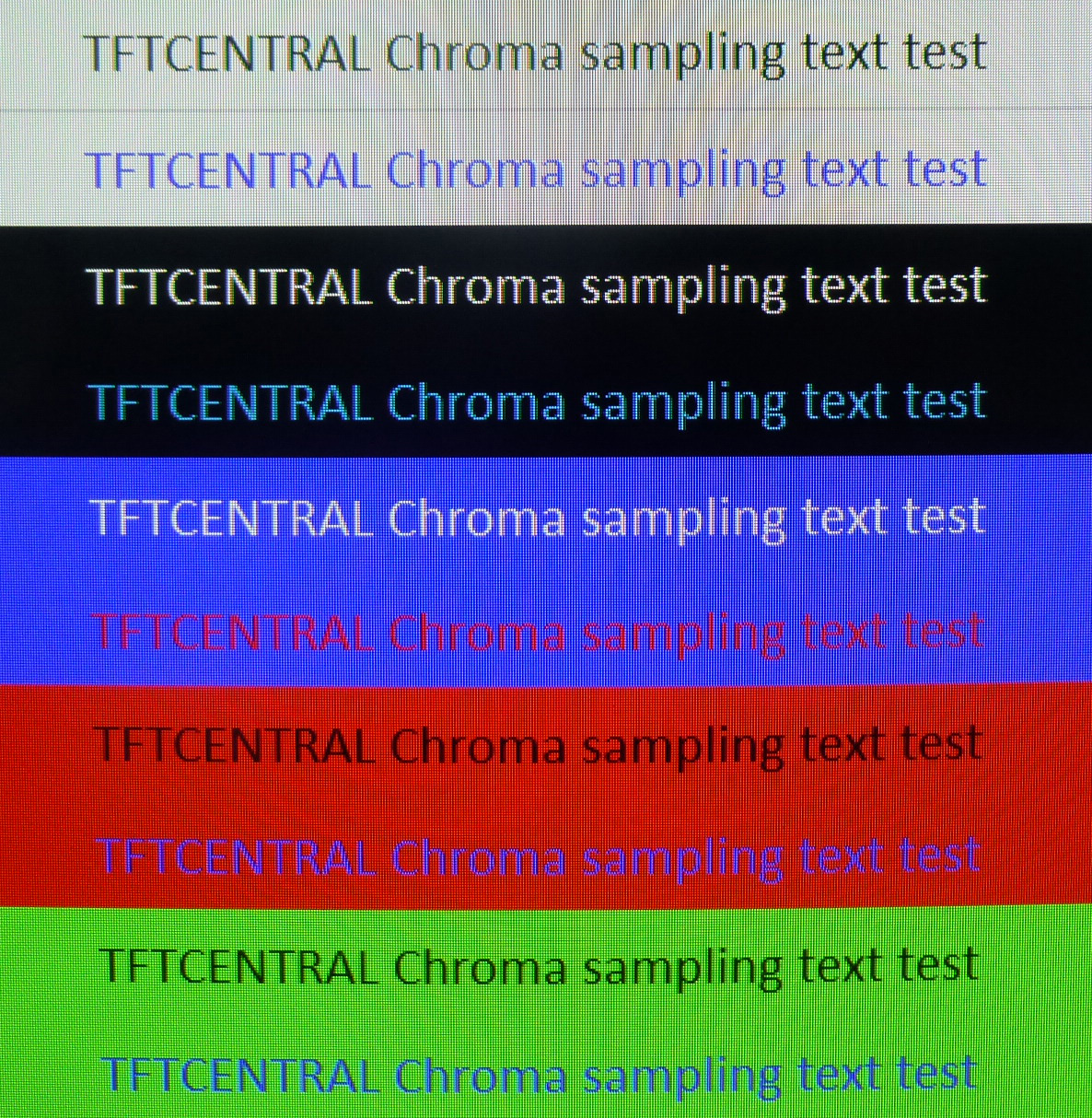 Обычный режим входа HDMI показывает некоторые проблемы с цветопередачей из-за падения цветности с 4:4:4 до 4:2:2 в других ситуациях. Мы запечатлели это на фотографиях ниже, где вы можете видеть, что красный и синий текст на красном и синем фоне более размыты и сжаты на фотографиях 4:2:2. Это вызвано субдискретизацией цветности. Мы рекомендуем придерживаться режима ввода ПК для использования на ПК.