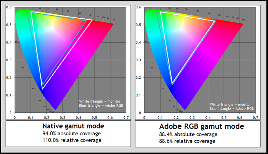 В экранном меню есть настройка гаммы специально для Adobe RGB, которую мы измерили справа. Вы можете видеть, что в зеленых тонах по-прежнему недостаточно покрытия, с этим ничего не поделаешь, экран просто не способен покрыть эти оттенки, несмотря ни на что. Но этот режим теперь очень хорошо сократил чрезмерное покрытие в синих и красных тонах, более точно соответствуя эталонному пространству Adobe RGB. Он пошел немного дальше, чем нужно, в результате чего теперь покрытие составляет 88,4%, но это лучшая эмуляция Adobe RGB, если вы хотите работать в этом пространстве.