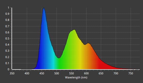 Экран имеет синий пик на длине волны 457 нм, и, хотя он не входит в линейку продуктов, сертифицированных для защиты глаз, он имеет синий пик, который выходит за пределы предполагаемого вредного диапазона согласно Eyesafe между 415–455 нм, что является хорошей новостью.. Кстати, по спектральному распределению, где сливаются зеленый и красный пики, видно, что наш образец является одной из панелей WBC, о которых мы говорили ранее. В экранном меню также есть настройка слабого синего света, которую вы можете включать и выключать. При его включении цветовая температура падает с наших калиброванных 6500k до ~ 5380k в режиме Expert Bright.