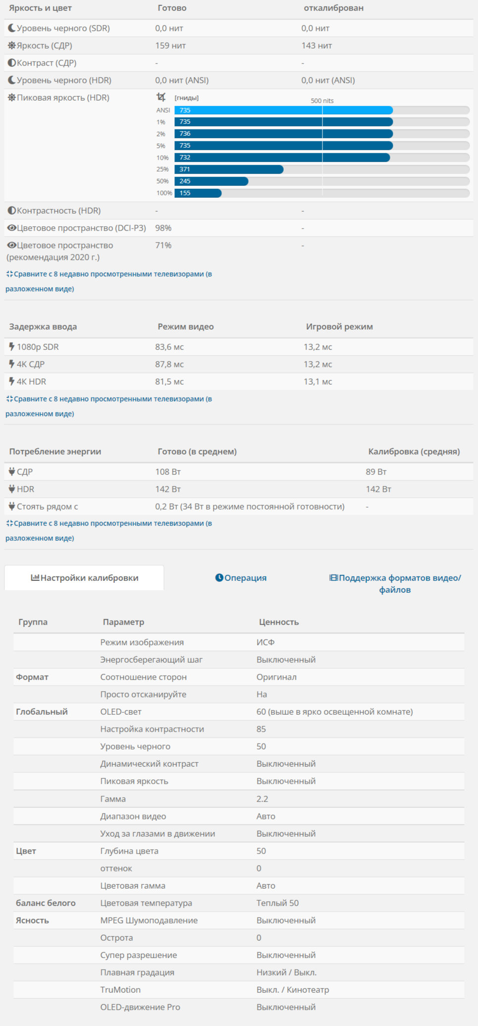 LG C2 соответствует 98% DCI-P3 и 71% Rec.2020, что соответствует другим OLED-телевизорам LG, включая прошлогодний C1. Мы подробнее остановимся на яркости HDR и пиковой яркости в разделе качества изображения.