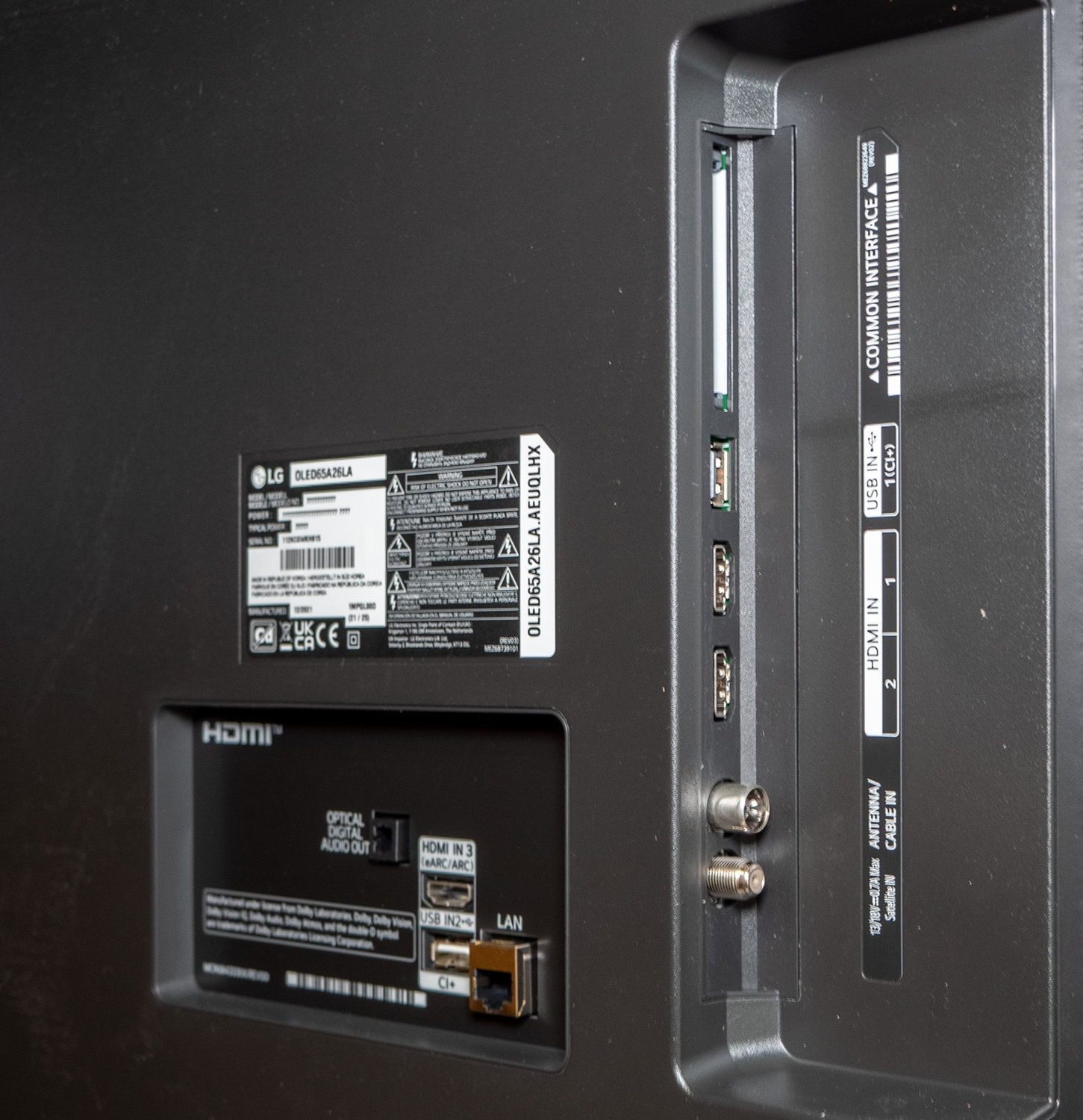 Задняя панель телевизора LG A2 оснащена следующими интерфейсами: один вход HDMI v.2.1 (совместимый с ARC и eARC), 2 антенных входа (для спутникового и кабельного/эфирного ТВ), компонентный AV-вход (только в версии для США), один порт LAN (со скоростью 100 Мбит/сек). Что касается аудио, то на этой же панели расположен оптический аудиовыход и выход 3,5" на наушники/акустику.