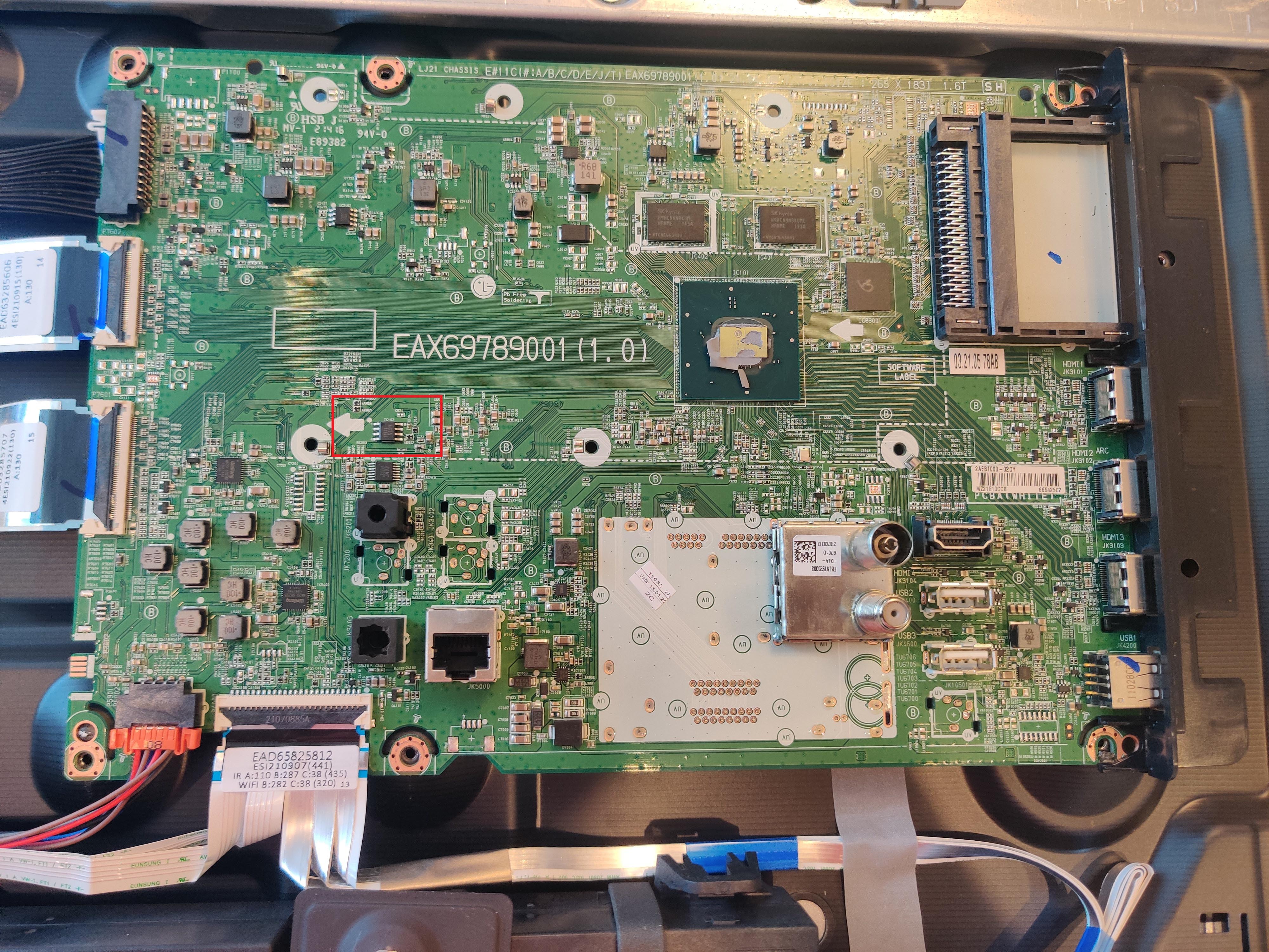Итак, приступим к снятию геоблока. 1) Первым делом пропускаю все настройки, захожу в сервисное меню. Вхожу в area option и выставляю там цифры 4816. Теперь смарт работает наполовину. Есть большинство популярных программ и сервисов. Но мы-то хотим русские сервисы. 2) Следующим шагом я заказал программатор из Китая CH341A с прищепкой (Али или Яндекс), подождал 2е недели его, и приступил к изучению работы на программаторе))) (легче было его купить в Москве, разница в цене 100р.) Итак, пришел программатор, и встал вопрос, как правильно снять заднюю крышку не повредив ничего. Нашел видео https://www.youtube.com/watch?v=Mtjg7d7BWy8 и снял заднюю панель по инструкции. Видим перед собой плату: