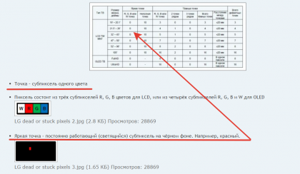 Сервис - не истина в последней инстанции, и если площадь постоянно горящего субпикселя ЛЮБОГО цвета будет соответствовать полной точке, то любой суд (а думаю производитель как раз предпочтет не доводить до суда) исходя из официально опубликованных данных в этой таблице без каких-либо двояких толкований признает установит наступление гарантийного случая и обяжет производителя выполнить условия гарантии.SCS писал(а):Там все на усмотрении сервис-центра, если речь идет о спорных случаях. Панель не будут менять из за одного зеленого субпикселя. Так - панелей не напастись. Тем более- зеленый и синий субпиксели - не увидишь с расстояния просмотра.