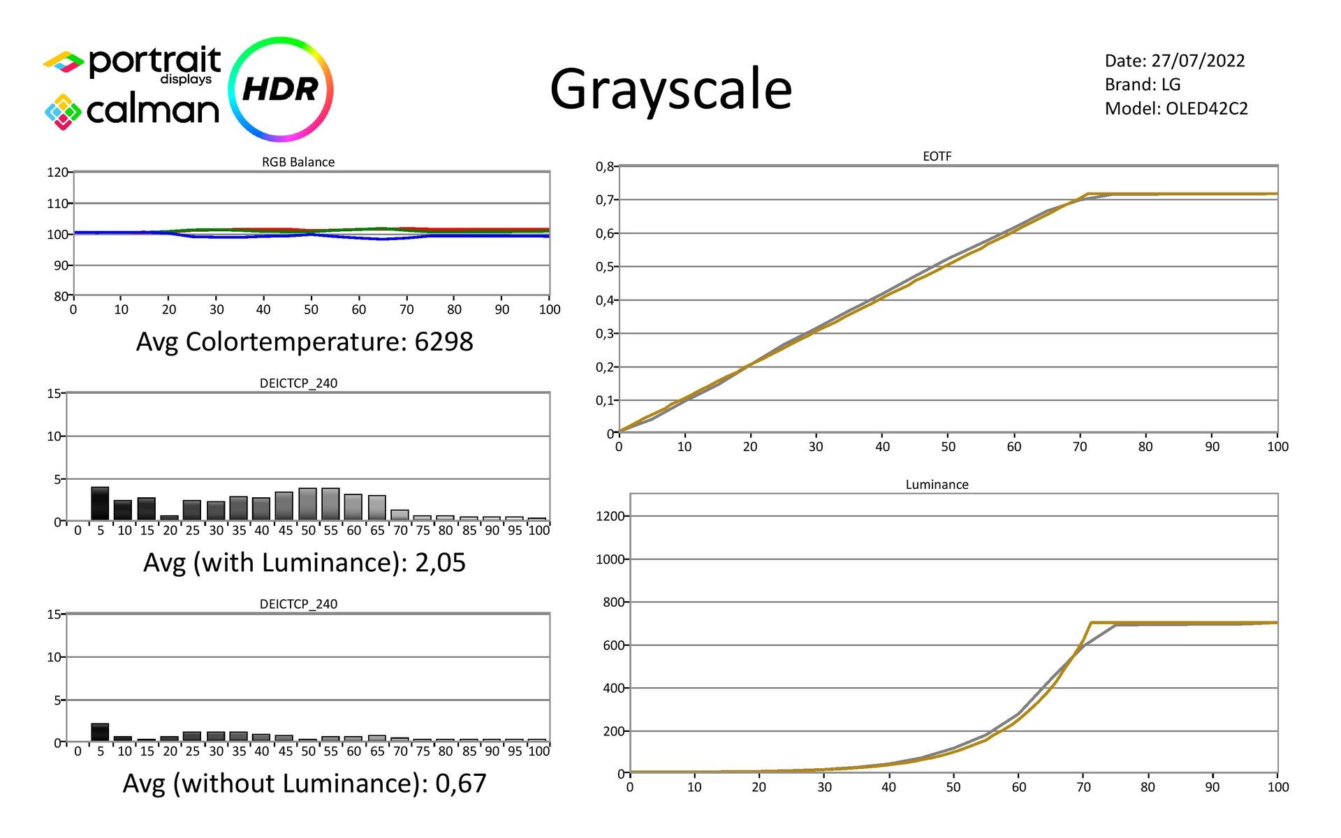 Как видите, мы получили эталонные результаты для 42-дюймового C2 с Autocal. Отслеживание оттенков серого идеальное, с ошибками DeltaE менее 0,5, что значительно ниже видимого порога в три. Гамма также идеально соответствует стандарту 2.4.