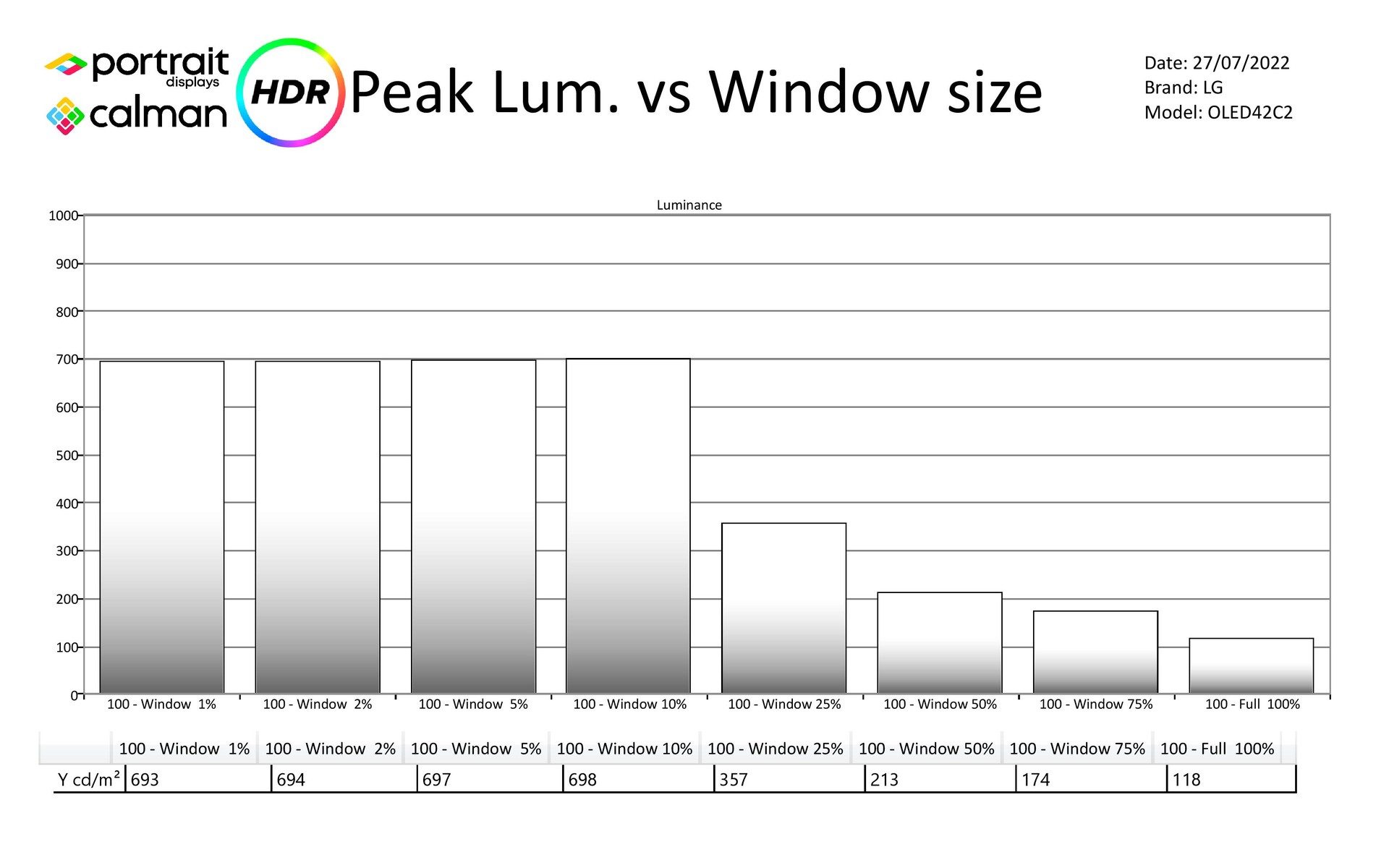 C2 поддерживает HDR10, HLG и Dolby Vision IQ, но не HDR10+. Но как этот маленький OLED показывает пиковую яркость? В окне 10% он по-прежнему достигает 715 нит, очень хороший результат, лучше, чем мы ожидали. Но ABL (ограничитель средней яркости) довольно сильно вмешивается, когда тестовое окно становится больше. На полностью белом экране у него осталось всего 117 нит.