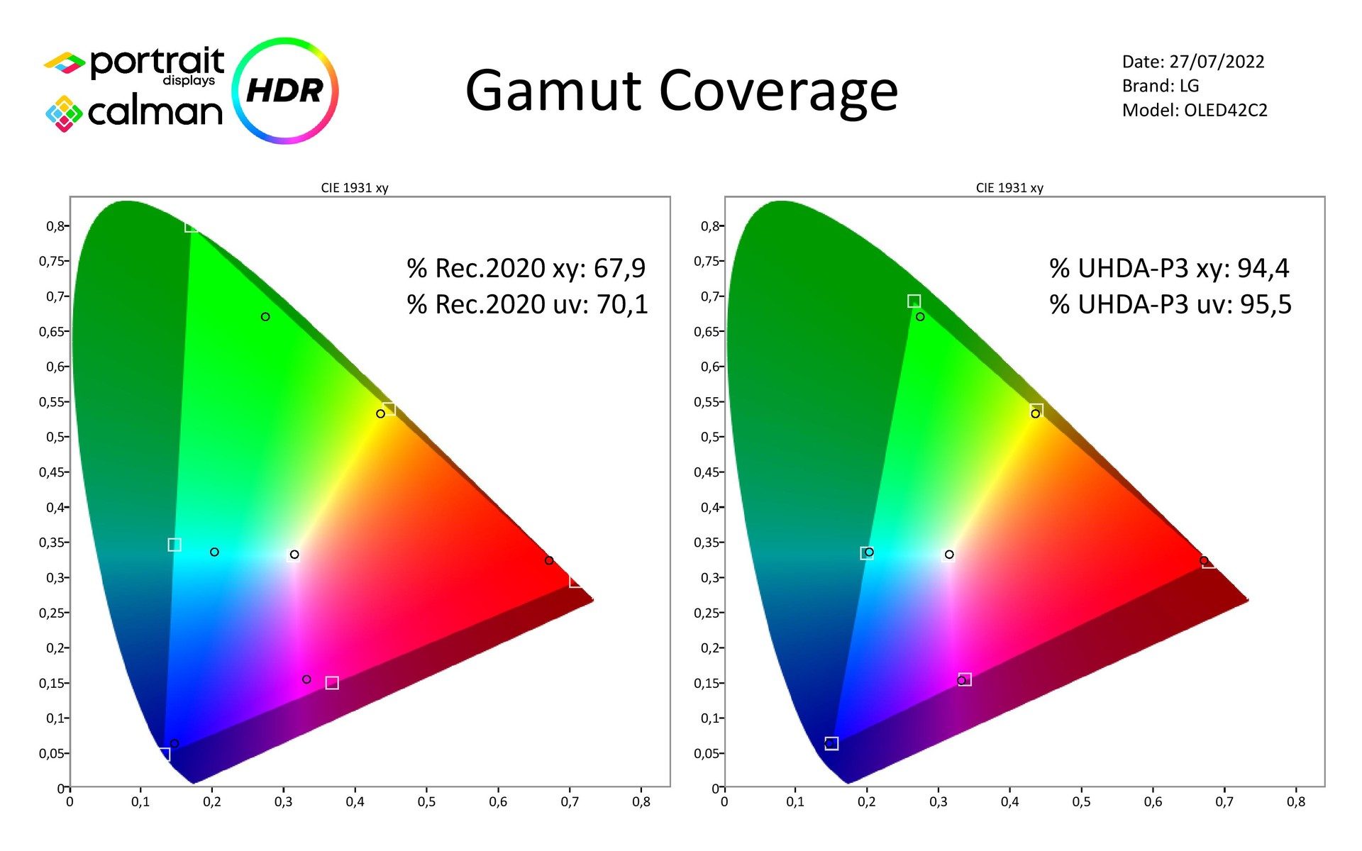 Мы измерили покрытие BT.2020 при 70% XY и 73% UV, при этом покрытие P3 составило 96% XY и 98% UV.