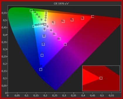 ЦветаНасыщенность цвета на отдельных анализируемых уровнях (от 0 до 100%, с шагом 20 pp) не показала существенных отклонений. Было заметно, что 100% красный цвет не перенасыщен, что порадует чувствительных к этому цвету пользователей.