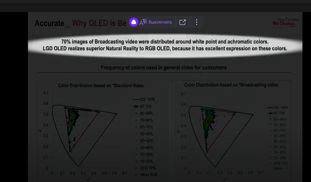 На 6 минуте рассказывается почему OLED WRGB правильнее схема чем OLED RGB.