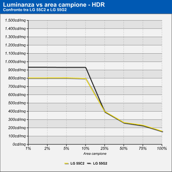Тест, который определяет интенсивность яркости по отношению к площади образца, уже показывает разницу в поведении, которую стоит прокомментировать. Фактически мы видим, что при площади поверхности до 10% яркость LG 55C2 примерно на 120 кандел на квадратный метр ниже, чем у «собрата», оснащенного радиатором. Еще более интересным является тот факт, что с большими поверхностями два телевизора фактически эквивалентны с точки зрения максимальной яркости, чтобы подчеркнуть, насколько наличие радиатора необходимо для того, чтобы панель могла отображать более высокие пики яркости.