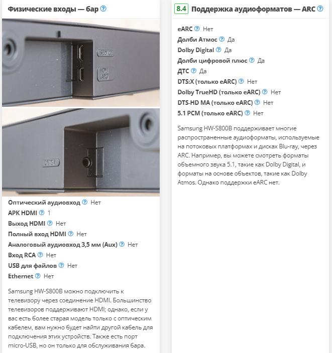 Samsung HW-S800B может воспроизводить форматы объемного звука 5.1, такие как Dolby Digital и DTS, которые обычно используются на потоковых платформах и на дисках Blu-ray. Однако, поскольку это панель 3.1.2, для ее воспроизведения необходимо преобразовать этот контент в стерео. Это означает, что вы не можете воспользоваться преимуществами технологии, из-за которой кажется, что этот звук простирается в пространство вокруг вас — вместо этого кажется, что звук исходит из динамика, расположенного перед вами.