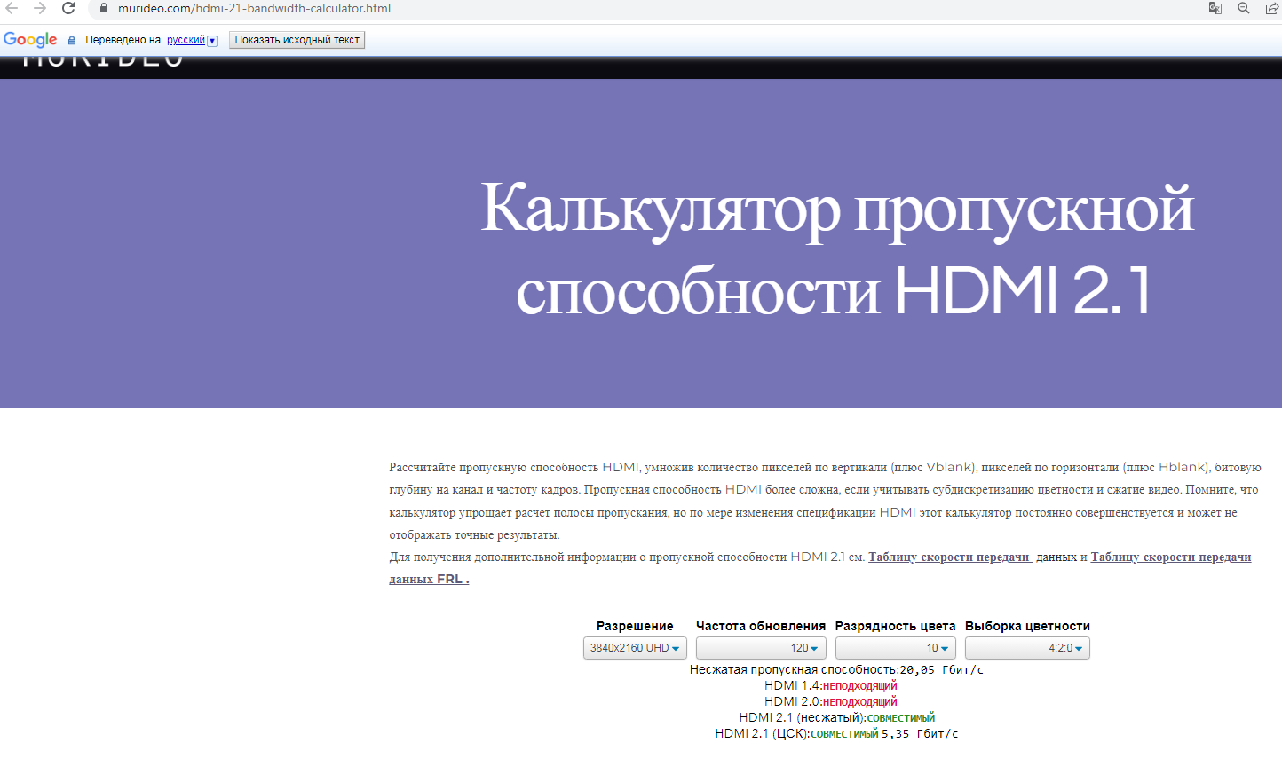 Нет, вот калькулятор https://www.murideo.com/hdmi-21-bandwid ... lator.html, из которого следует, что 4K @ 120 @ 10bit (= это минимум для глубины цвета HDR) нельзя передать по интерфейсу HDMI 2.0 ни c какой субдискретизацией. И загвоздка тут будет не в кабеле (по которому пока нет никакой характеризующей информации. О том, как кабеля должны быть промаркированы - по данной в предыдущем сообщении ссылке), а в том, что на это не способен HDMI-интерфейс видеокарты)ivaneska писал(а):Также в видеокарте присутствует разъём hdmi 2.0b, но к нему уже подключен кабель монитора. Судя по вики и твоей информации, этот кабель должен передавать сигнал в 4к 120 гц + hdr.