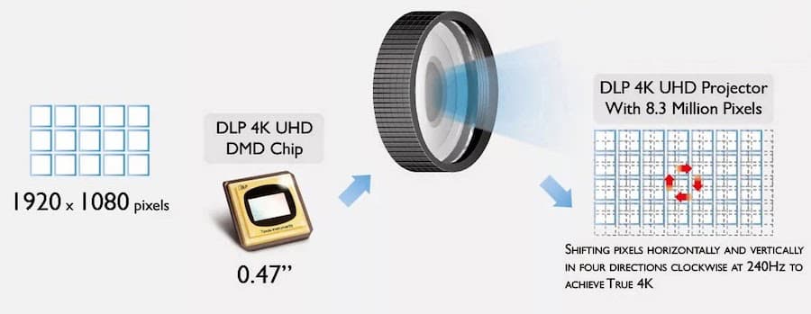 Картинка в разрешении 4К формируется технологией XPR4 с 4-сторонним сдвигом пикселей. Лазерно-фосфорный источник света обладает запасом 20 000 часов. Световой поток — 2500 ANSI люмен. Заявлено 85-процентное покрытие цветового пространства DCI-P3.