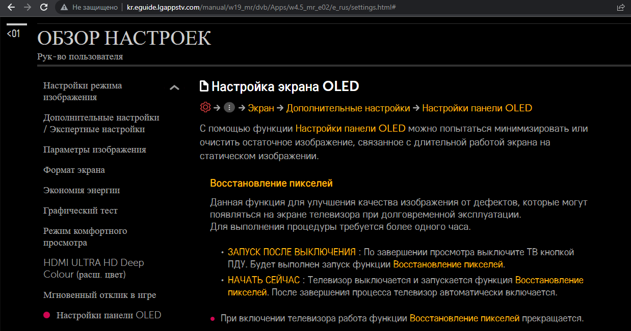 Так она не поможет ни чем, если произойдет подобное narpol @ Выгорание OLED и остаточное изображение. У принудительного запуска данной процедуры есть смысл только разовый, на начальном этапе эксплуатации новой панели/ТВ, как возможно помогающее средство для борьбы с Бандинг на экране телевизора (banding). В остальных случаях "умный" ТВ сделает все сам Функция "Очистка пикселей" ("Восстановление пикселей") на OLEDБильбо писал(а):нет, но вот потому что б/у брал и подумываю может надо прогнать процедуру...