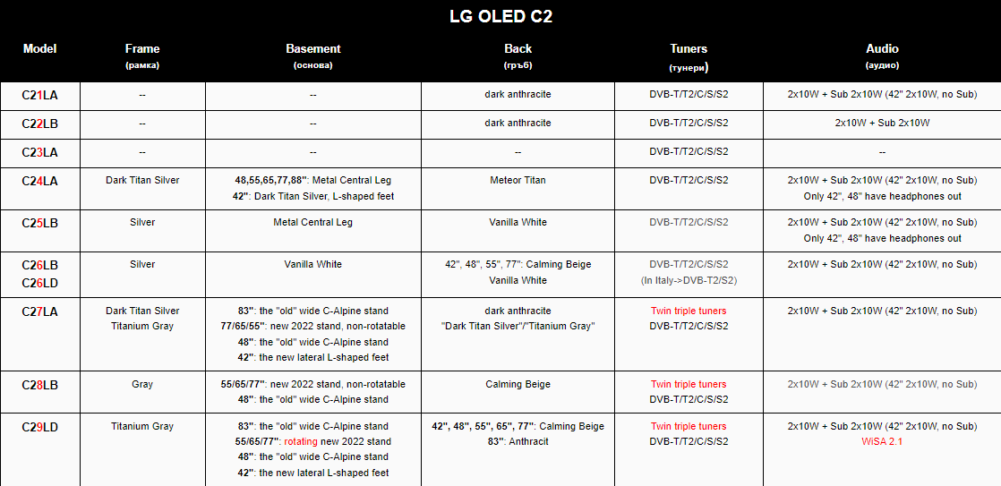 В этом году снова будет несколько вариантов модели C2, которые получат обозначения C24, C25 и C26, за которыми следуют две буквы. Номер относится к региону. Если название модели заканчивается на «B» или «D», она будет иметь белую заднюю панель и подставку более светлого оттенка. Если название модели заканчивается на «А», задняя часть будет черной. Модели «D» имеют поворотную подставку, которую можно вручную повернуть на 20 градусов от центрального положения.