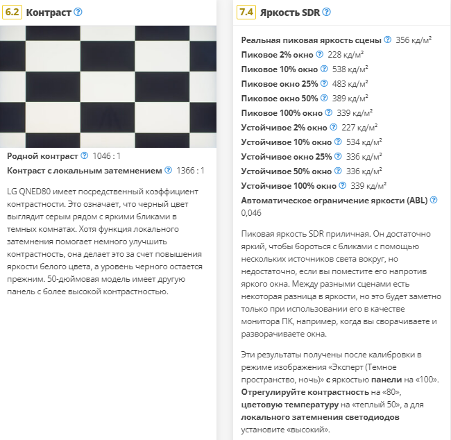 Модель QNED80 поддерживает технологию локального затемнения светодиодной подсветки матрицы (см. Технология локального затемнения экрана (Local Dimming)). Когда на определённом участке экрана в изображении преобладают тёмные элементы, яркость светодиодов блока, подсвечивающего этот участок, снижается для улучшения уровня чёрного (повышения контрастности).