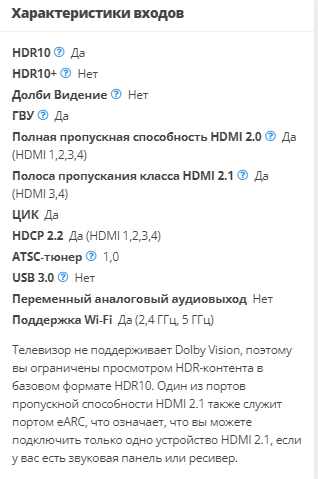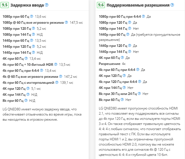 Примененный в QNED80 новейший интерфейс HDMI 2.1 обеспечивает в разы большую пропускную способность по сравнению с HDMI 2.0 (48 Гбит/с против 18 Гбит/с), что позволит выводить изображение в более высоком разрешении. В частности, появилась поддержка режима 4K/120 Гц. Кроме того, HDMI 2.1 принес поддержку функции Variable Refresh Rate (VRR), являющейся аналогом технологий синхронизации AMD FreeSync и Nvidia G-Sync, а Dynamic HDR позволит обеспечить работу расширенного динамического диапазона (HDR) на покадровом уровне, что должно ещё больше улучшить качество изображения на совместимых мониторах или телевизорах.