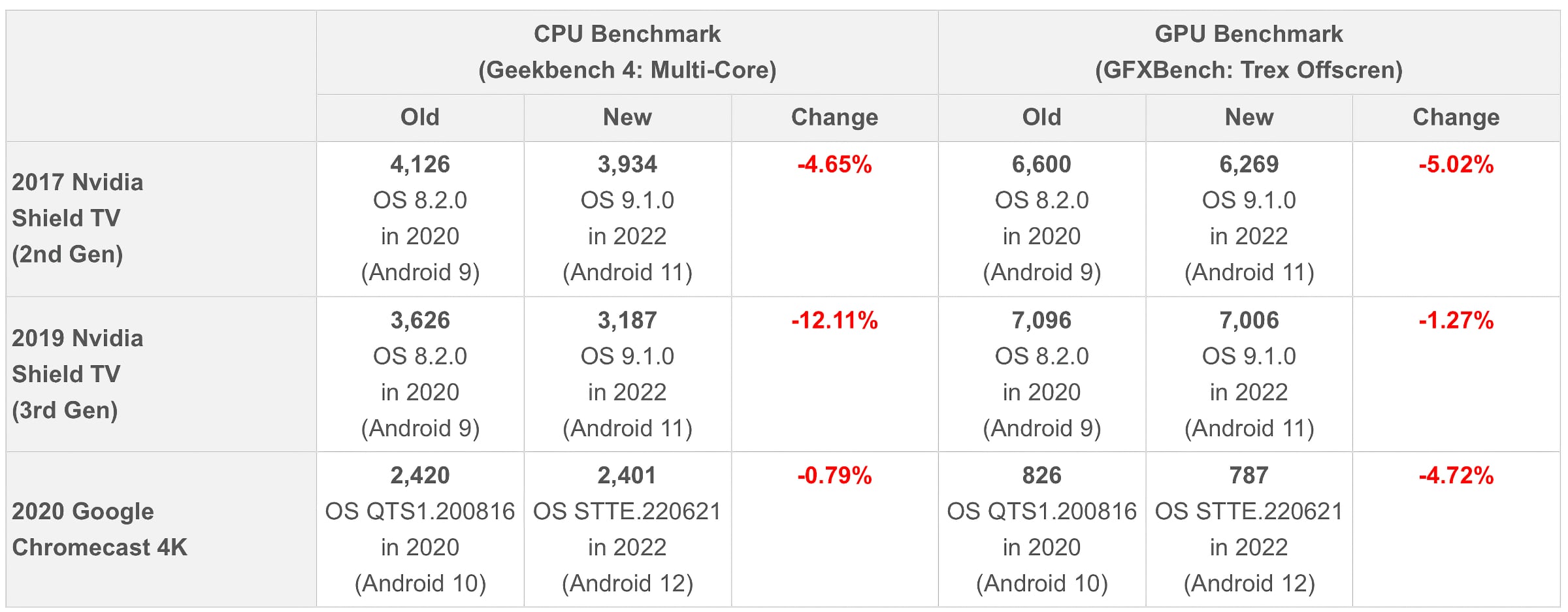 Ранее в этом году Nvidia выпустила Android 11 для Shield TV. Помимо множества ошибок, обновление, по-видимому, снизило производительность процессора и графического процессора. Точно так же Chromecast с Google TV (4K) снизил производительность графического процессора после недавнего обновления до Android 12.