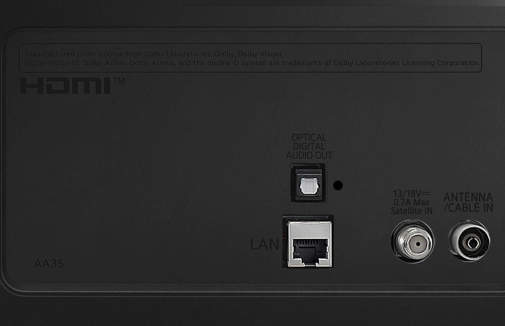 Задняя панель телевизора LG LQ6300 оснащена следующими интерфейсами: 2 антенных входа (спутник/кабель) и 1 порт LAN. Что касается аудио, то на этой же панели расположен только оптический аудиовыход, а выход 3,5 мм для наушников и выход аудио RCA (тюльпан) на два канала отсутствуют.