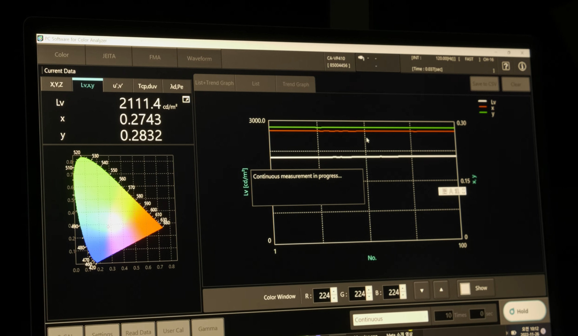 Сначала начнём с прошлогодней, и вы можете видеть, что мы получаем пиковую яркость порядка 1367 нит в 3% окне (0:25). Затем замеряем панель с технологией Мета и получаем 2112 нит (0:36), что означает увеличение более чем на 60%. Обратите внимание, что эти цифры были получены при исходной точке белого панели более 9000 Кельвинов. Поскольку Метапанель была лишь предсерийным образцом с рудиментарным SoC.