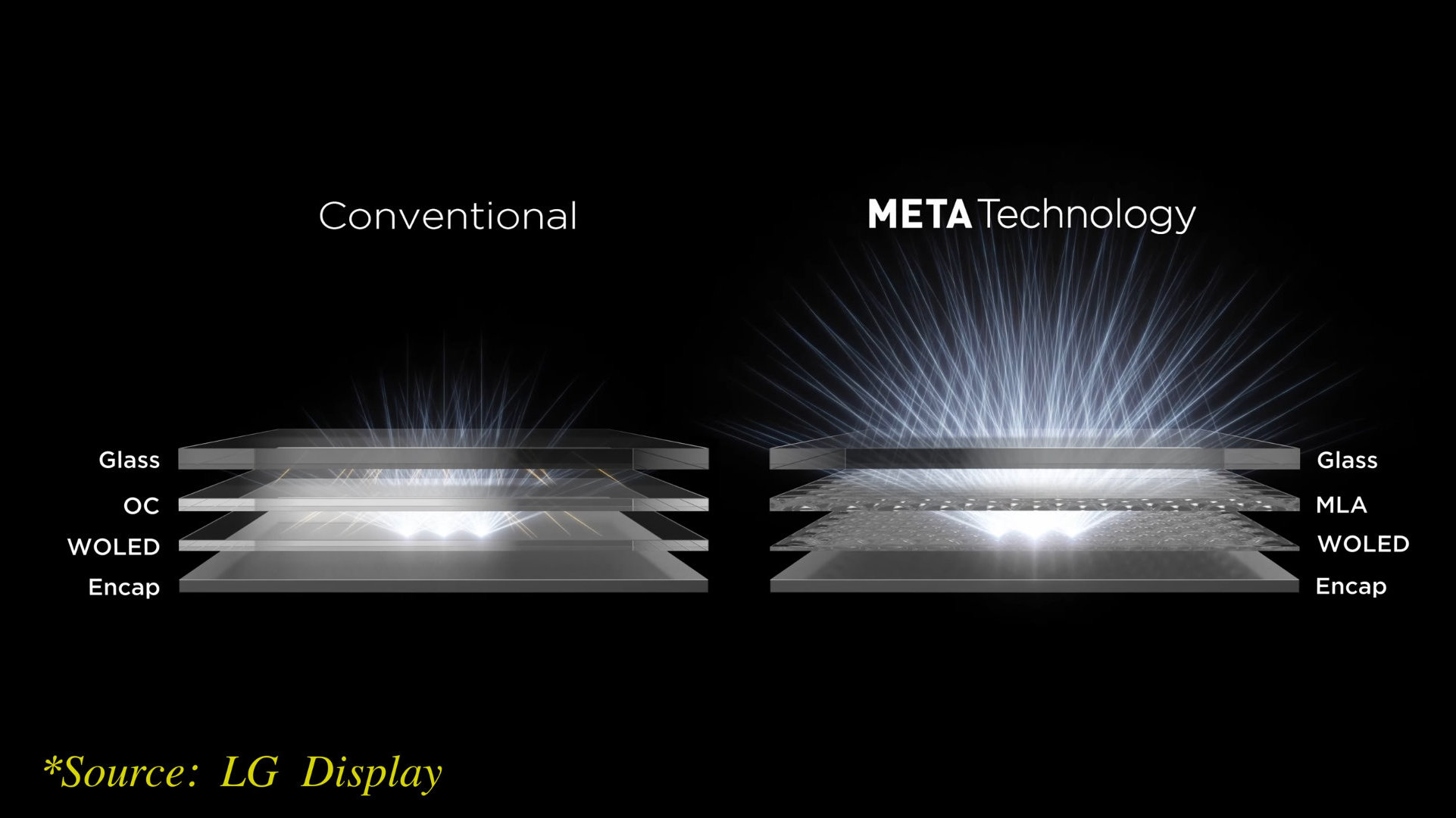 Ответ, это использование MLA или массива микролинз, названный южнокорейским производителем ОЛЕД-панелей как Мета технология, при которой слой выпуклых линз микрометрового размера наносится на ОЛЕД-панель для получения более высокой светоотдачи от экрана. Чтобы объяснить на обычной ОЛЕД-панели без такой технологии незначительная часть света будет потеряна из-за внутренних отражений внутри панели (2:47), что конечно же менее эффективно чем хотелось бы.