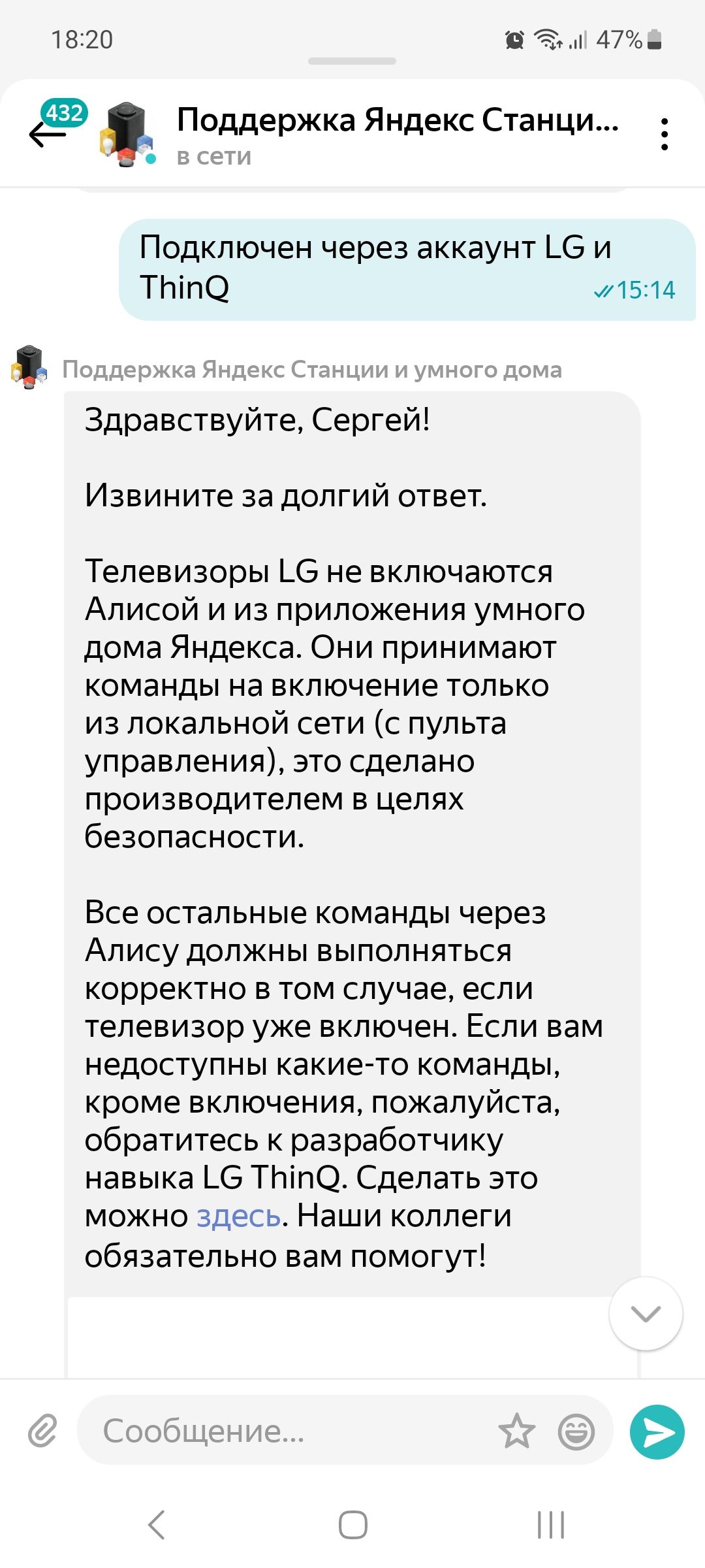 Приветствую сообщество webOS, зарегистрировался здесь т.к. на свою голову приобрел LG OLED C2 65' (LG OLED65C22LB), вот теперь разбираюсь как же-ж на него поставить Алису. Дело в том, что я пытался привязать Умный Дом с Алисой (от Яндекса) и мой C2 (при помощи ThinQ), вроде все делаю правильно, в ThinQ приложении телек обнаружился (управляется с него и т. п.), а вот Умный Дом с Алисой ни в какую не видит мой ТВ. Я тут прошерстил форум, но инфы по этому поводу не нашел.